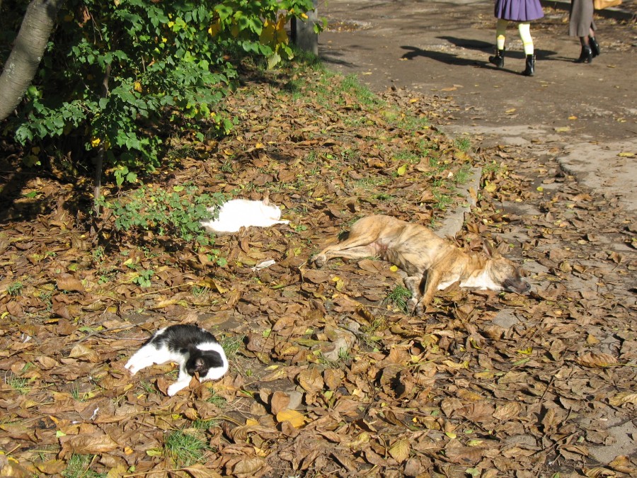 На следующий день небо прояснилось, показания термометра поползли резко вверх. Толерантные коты греются на солнце рядом с толерантной псиной: